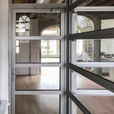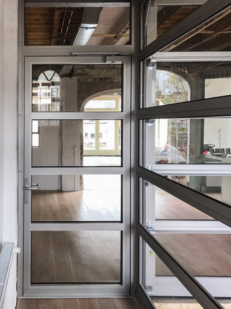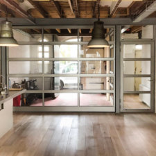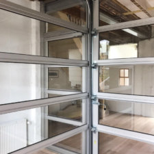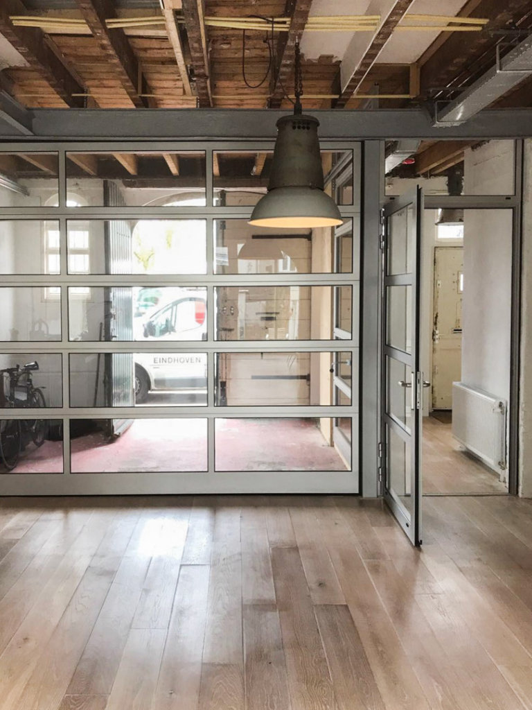 In dit historische koetshuis hebben wij op een bijzondere manier de leefkeuken toegankelijk gemaakt door middel van het plaatsen van garagedeur en wand met volglas panelen en een aparte loopdeur. De ruime hal is door het plaatsen van de garagedeuren afgescheiden van de leefkeuken maar toch blijft de grote ruimte één geheel tot aan de oude poort aan de voorzijde van het pand. Het glas laat in de achterliggende leefkeuken veel licht toe en geeft zicht op de poort.