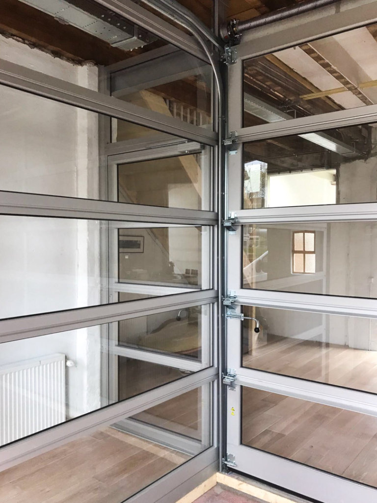 De rechterzijde is afgeschermd met een volglaswand van het zelfde materiaal en geeft zo een opgang vanaf de voordeur naar de keuken, die toegankelijk is met de geplaatste loopdeur. Het frame en het glas van de garagedeur heeft een hoge isolatie waarde, waardoor het in de keuken altijd behaaglijk is. De elektrische garagedeur kan uiteraard ook omhoog, waardoor is de hal en keuken een geheel vormen.